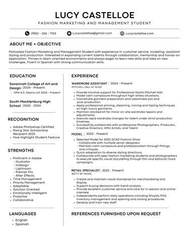 Lucy Castelloe is a sophomore Fashion Management and Management student at the Savannah College of Art and Design. Driven by the creativity, strategy, and connection that define the fashion industry, she aspires to make an impact through collaboration, leadership, and hands-on experience.